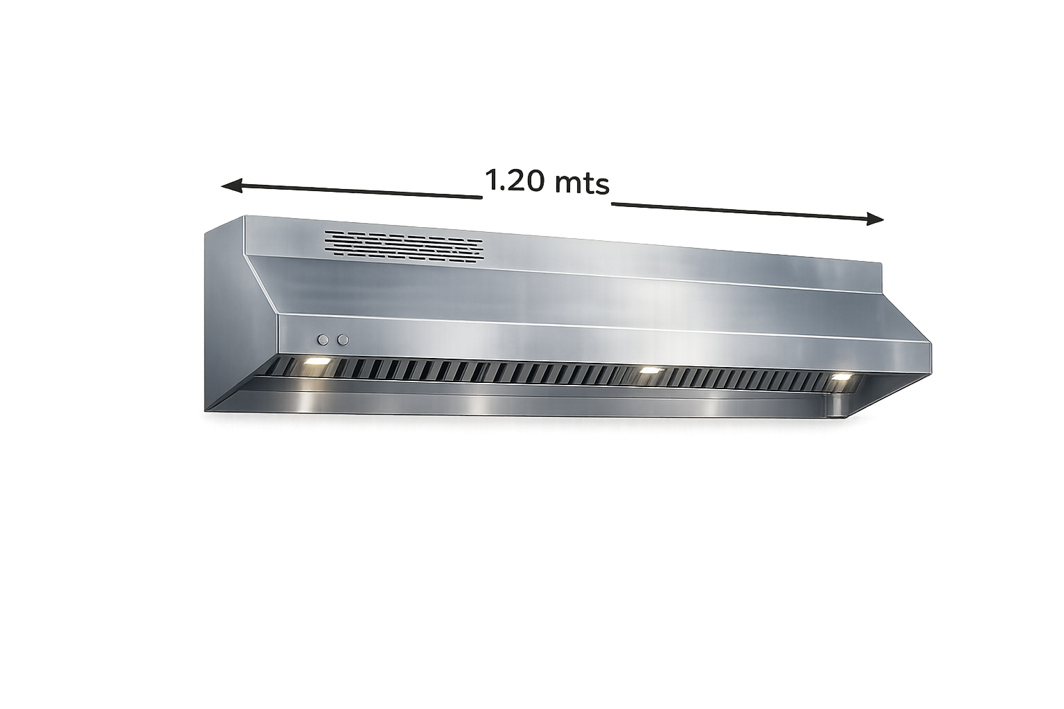 Campana mural de 1.20 m en acero inoxidable, ideal para la extracción eficiente de humos y grasas en cocinas industriales, con diseño robusto y fácil limpieza.