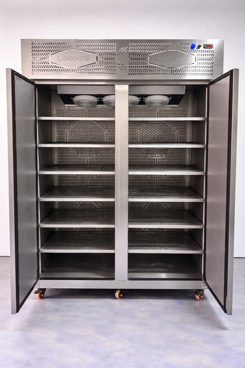 El equipo cuenta con estructura en acero inoxidable, sistema de refrigeración forzada, estantería interna regulable en acero perforado y control digital de temperatura, lo que permite una distribución homogénea del frío, fácil limpieza y alta eficiencia operativa. Su diseño robusto incorpora ruedas de alta resistencia para facilitar la movilidad y el mantenimiento, asegurando durabilidad y cumplimiento de estándares de higiene industrial.