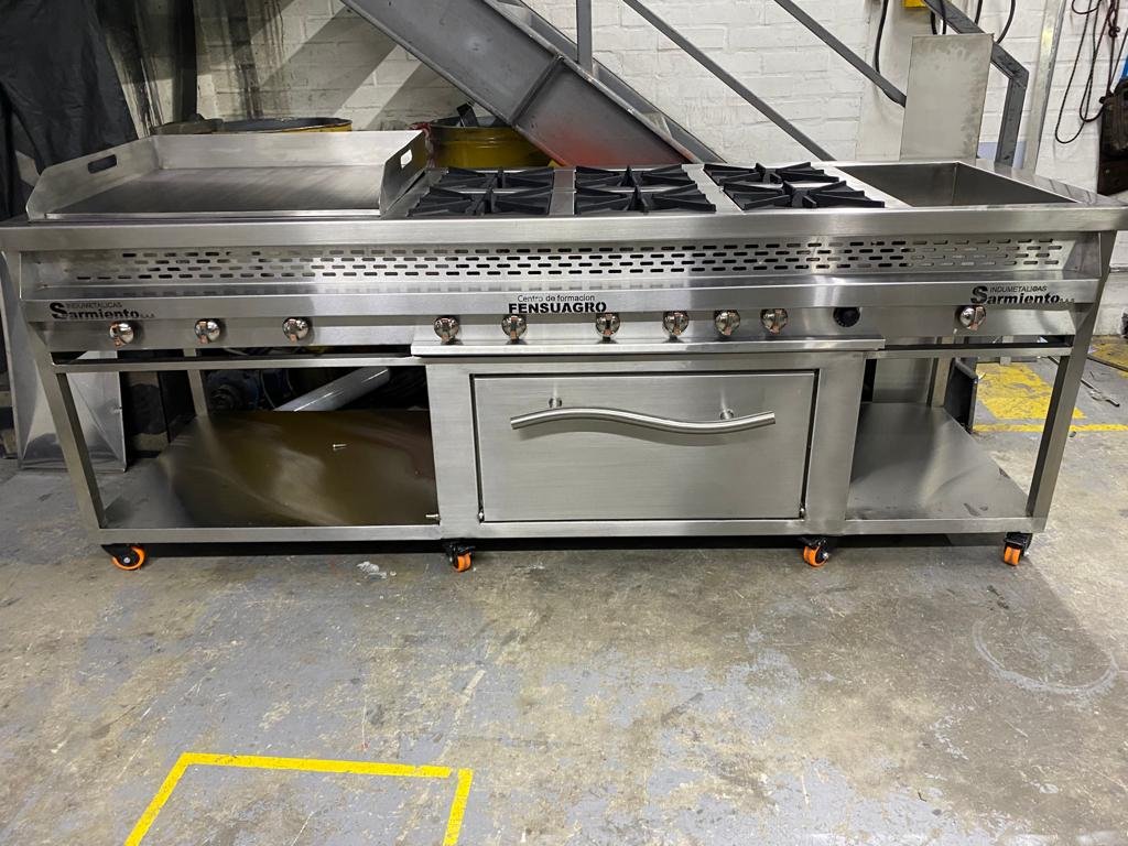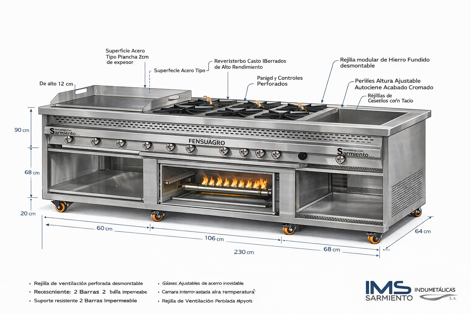 Indumetálicas Sarmiento desarrolló esta solución atendiendo una necesidad específica de optimización del espacio y concentración de procesos de cocción, ajustando dimensiones, potencia de los quemadores y configuración general según el flujo real de trabajo del cliente. El resultado es una línea de cocción personalizada, confiable y diseñada para responder a las exigencias de cocinas industriales y de producción intensiva.