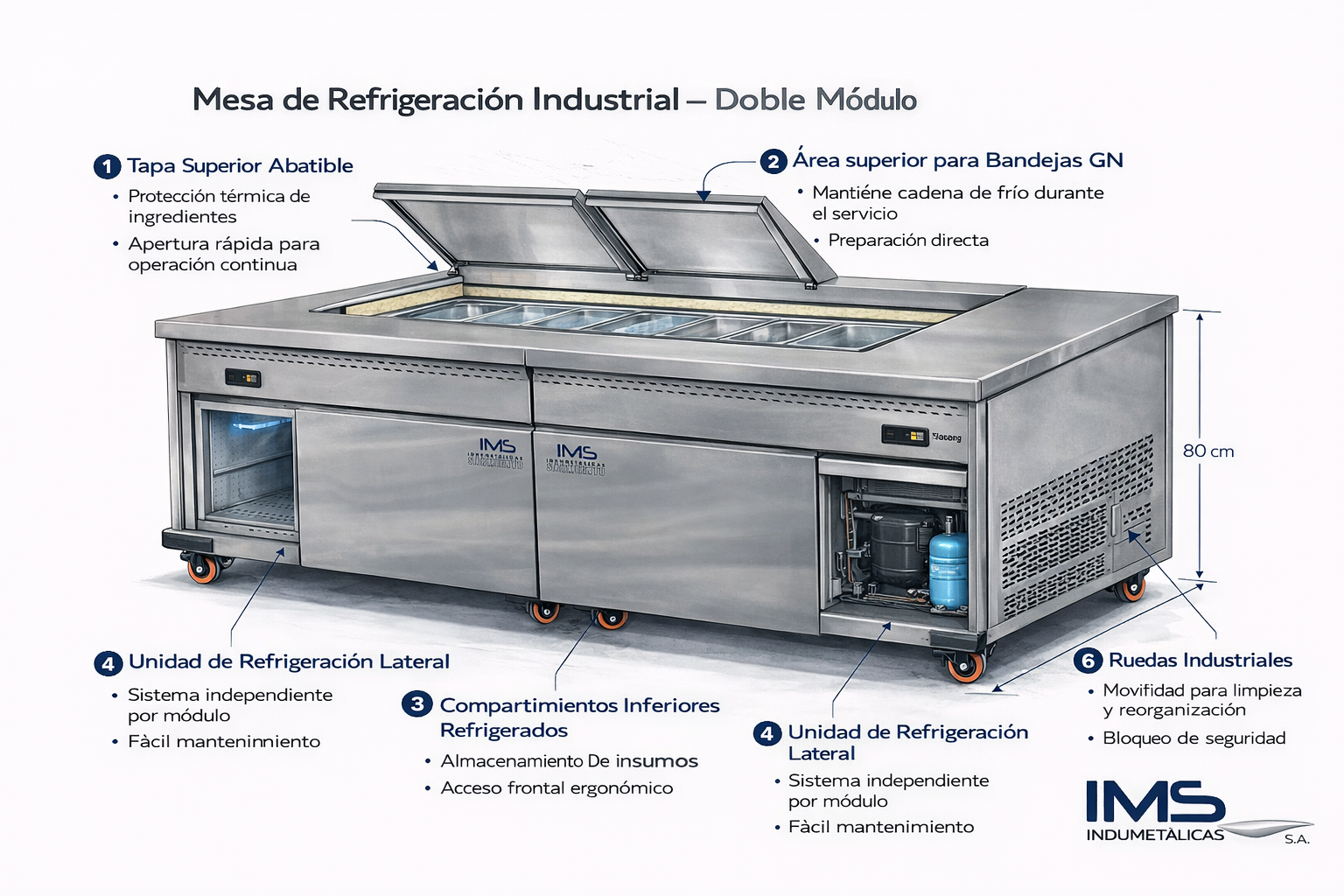 Las bases cuentan con sistema de refrigeración forzada, control digital de temperatura, tapas superiores abatibles con compartimentos gastronorm y estructura robusta en acero inoxidable, garantizando higiene, durabilidad y conservación uniforme de los alimentos. Su diseño incluye ruedas de alta resistencia que facilitan la movilidad y el mantenimiento dentro del área de trabajo.